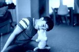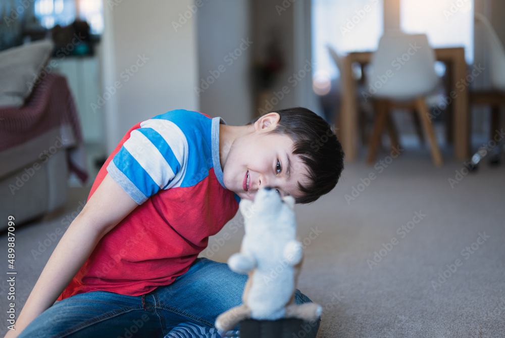 Happy young boy lying on floor playing with dog toy, Kid with smiling face playing alone at home on weekend, Positive Child relaxing at home in the morning
