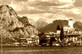Idyllic lake scenery - beautiful Lago di Garda, view of Malcesine village surrounded by Alps mountains. North of Italy