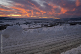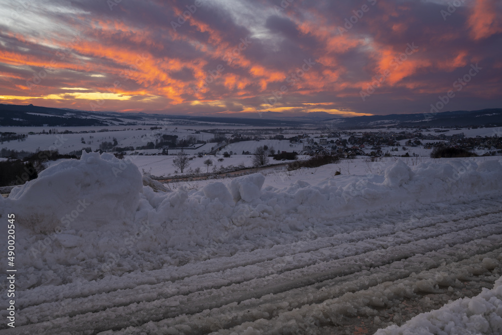 mountain road in snowy winter during a magnificent sunset