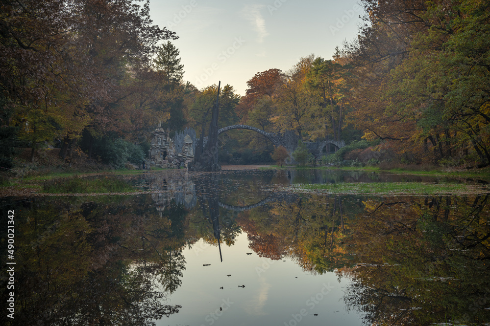 Bridge in rhododendron park in Kromlau in a beautiful autumn mood