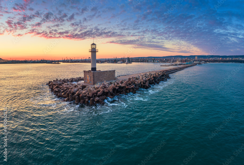 Aerial view of lighthouse at sunset in Varna, Bulgaria