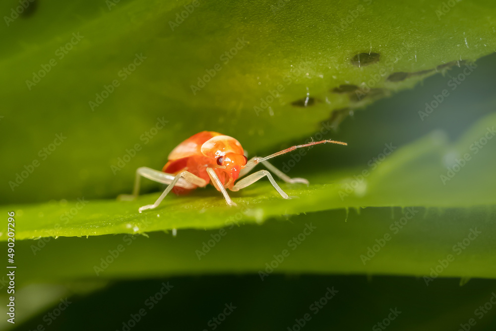 Extreme close up shot of tiny red young lady bird