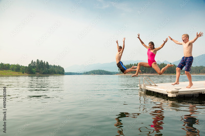 Group of kids jumping off the dock into the lake together during a fun summer vacation.