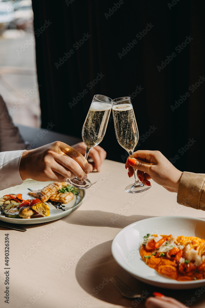 Closeup of a man and woman clinking glasses with champagne at a restaurant.