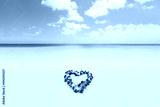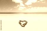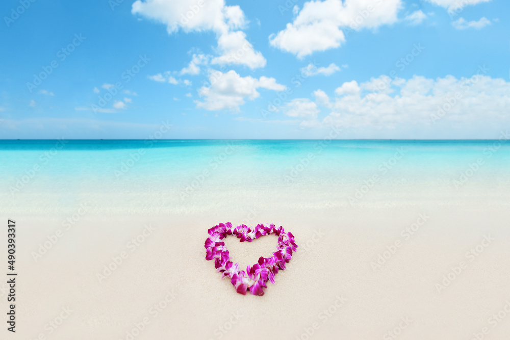 Heart shape lei flowers on perfect white sand beach for Hawaii honeymoon romantic vacation getaway travel. Pink orchids flower necklace lying on paradise background.