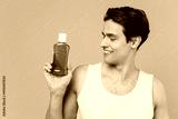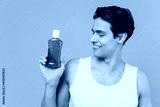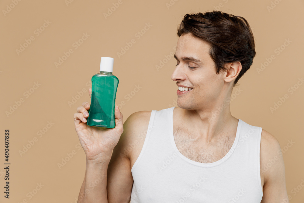 Attractive satisfied young man 20s perfect skin in undershirt hold tooth mouth rinse bottle isolated on pastel pastel beige background studio portrait Toothcare healthcare cosmetic procedures concept