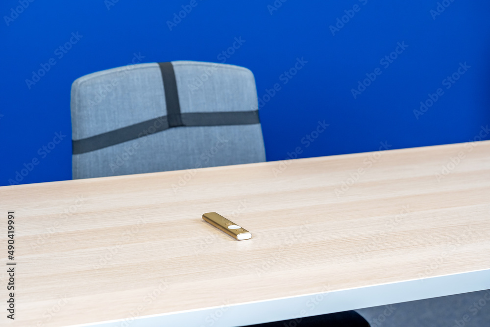 Empty modern studio conference room table, chair and a presentation remote control, blue screen. Lecture hall, course, talk or seminar, live stream broadcast abstract concept, nobody, no people