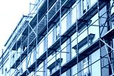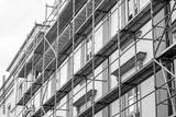 Scaffolding on a generic old tenement house, renovated historical building facade detail, closeup, nobody. Restoration industry, old architecture, real estate renovation simple concept, no people