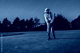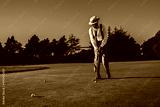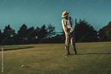 View of a fancy mature African guy in an elegant retro outfit with a straw hat and a tie hitting the ball with a club while standing on the lawn of the private golf club on a warm sunny evening