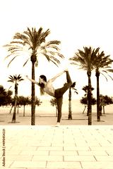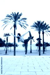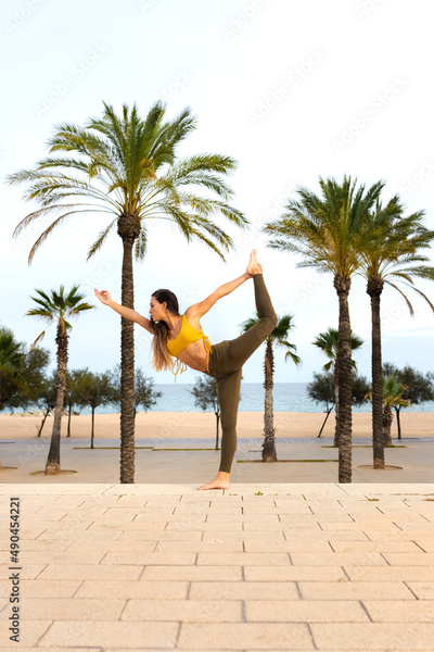 Young woman doing Lord of Dance, Natarajasana yoga pose. Beach background with palm trees. Vertical image. Copy space.