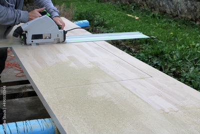 Homme qui découpe un plan de travail, pose de l'évier de la cuisine