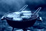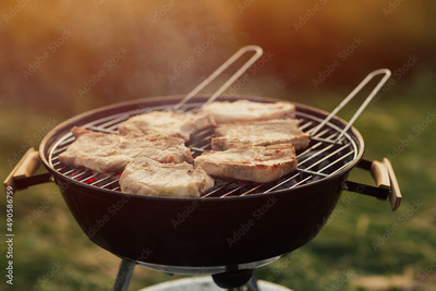 Barbecue grill with tasty steaks outdoors at summer picnic.
