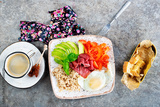 Bowl with bulgur, ham, chicken, eggs, avocado, fresh herbs, and tomato. Bright, summer colors.
