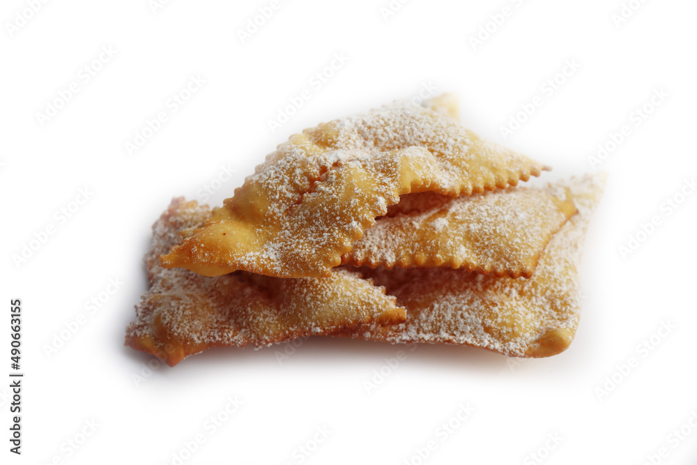 Traditional italian crisp fried Crostoli or Chiacchere( also called frappe, bugie, cenci, galani) for Carnival with powdered sugar isolated on white background
