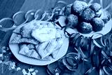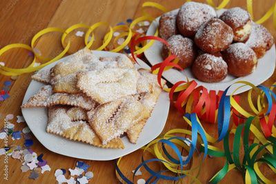 Traditional italian Crostoli ( also called chiacchere, frappe, bugie, cenci, galani) and fritters called Frittelle with cream on wooden table with Confetti and coloful Carival decorations