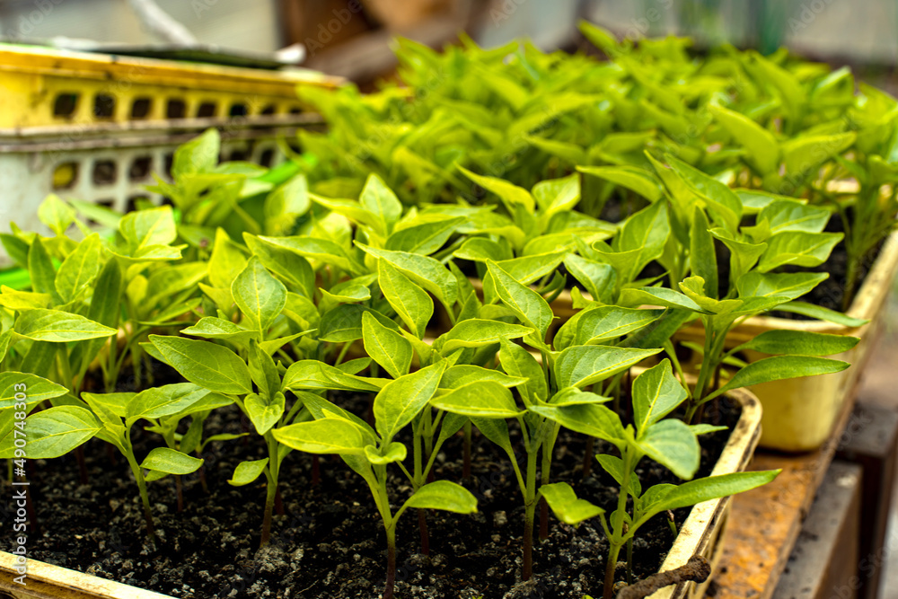 Home seedlings of peppers. Young shoots of plants in a greenhouse. Vegetable sprouts for planting in the garden. Domestic method of growing food