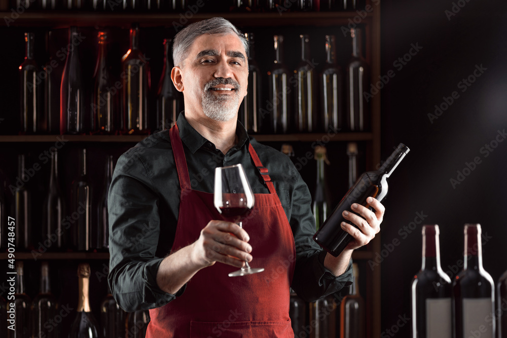 Winemaker examinating wine products among shelves of wine bottles. Stylish middle-aged man with a grey beard