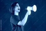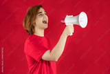 Young man using an electric megaphone. Guy with speaking-trumpet, bullhorn, blowhorn, or loudhailer. Red background. Advertising, demonstration, student protest concept