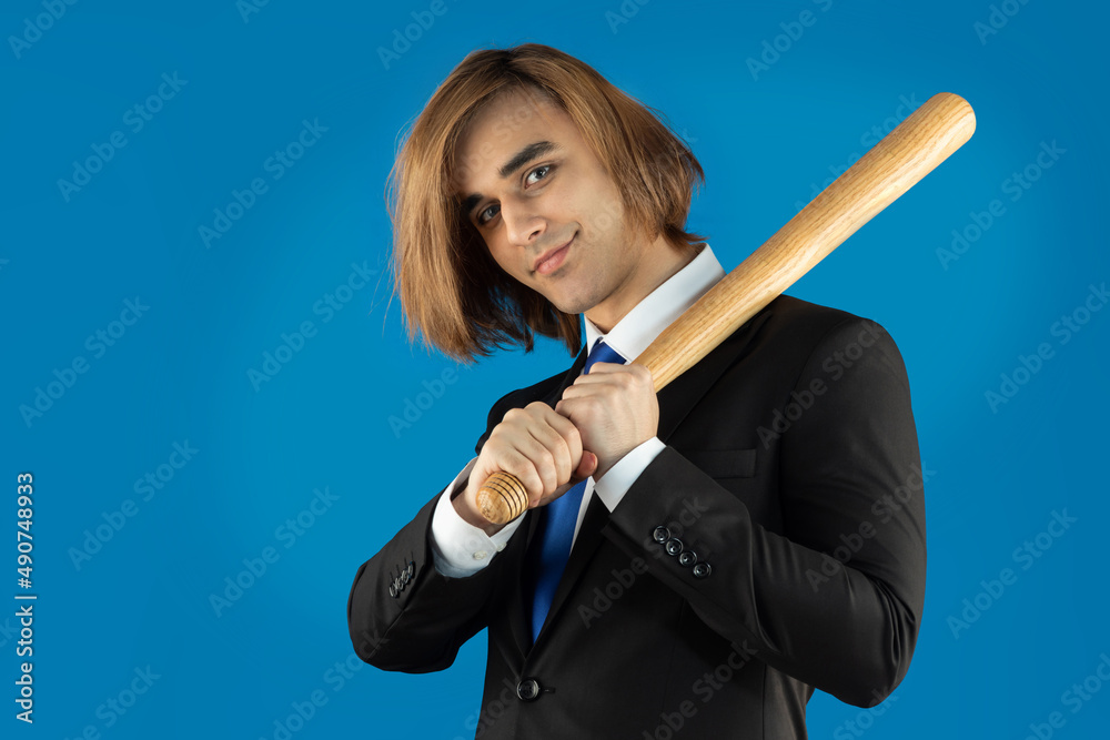 Young man holding baseball bat. Prep Student with long hair wearing a formal suit. Portrait of dangerous risky guy with wooden club