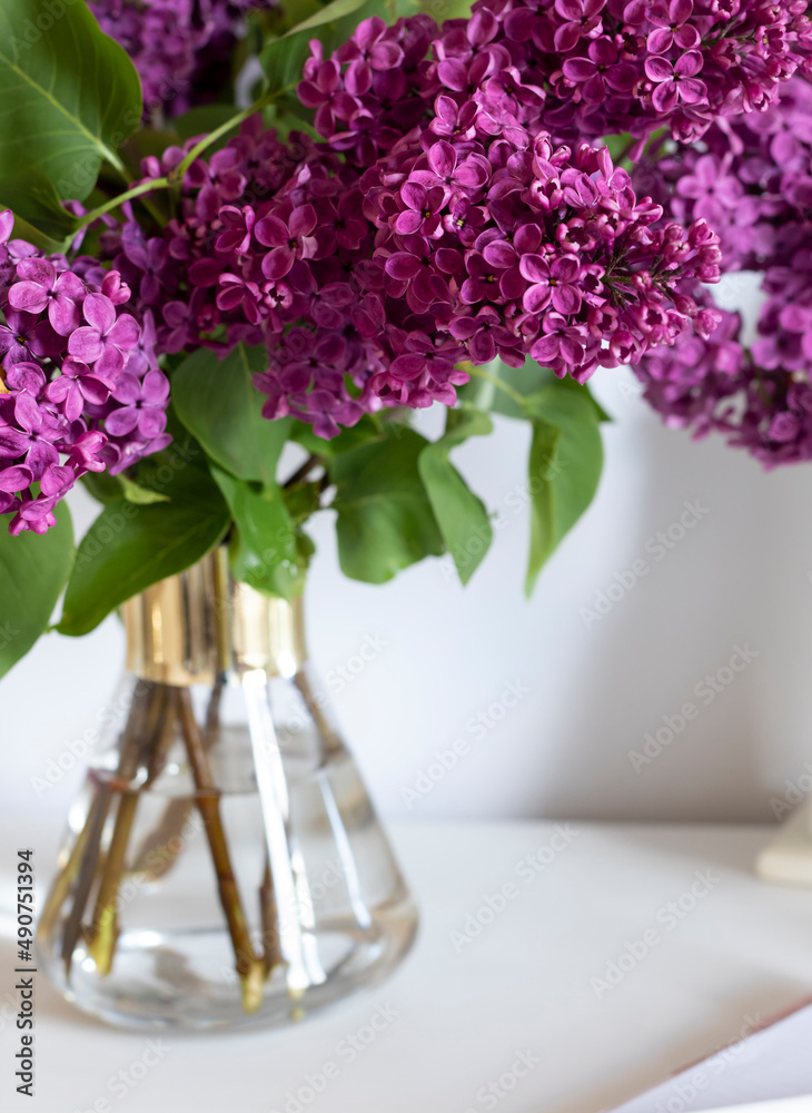 Bouquet of Violet lilac in a vase on the dressing table. Close up