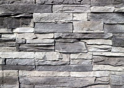 Cladding wall made of stacked rough natural stones. Colors are shades of gray. Background and texture.