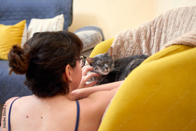 A closeup of a woman playing with her gray cat in a room