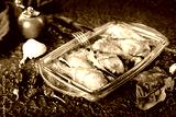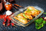 chicken legs baked in with fresh garlic and herbal close-up in a baking dish on the table.