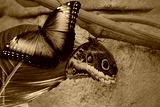 Beautiful closeup of two Peleides blue morpho butterflies, one with open and one with closed wings, Tropical butterfly specie from America