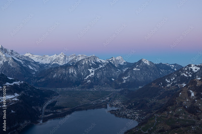 What a wonderful sunrise in the Swiss Alps, in the canton of Glarus to be exact. The sky turns red and pink over the mountain peaks.
