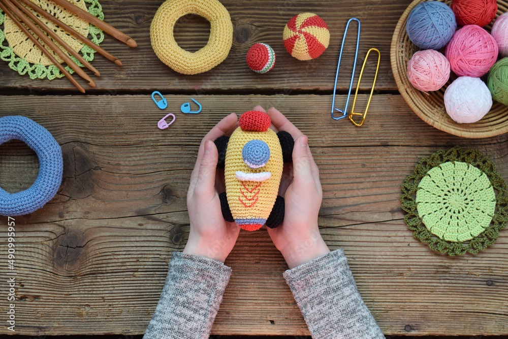 Making colored crochet racing car. Toy for babies and toddlers to learn mechanical skills and colors. On the table threads, needles, hook, cotton yarn. Handmade crafts. DIY concept.