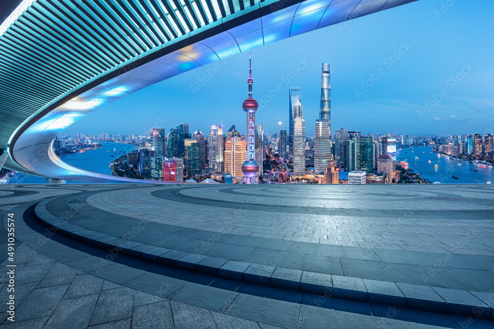 Empty square floor and city skyline with buildings in Shanghai at night, China.