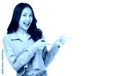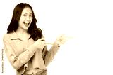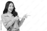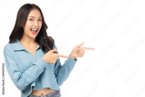 Smiling Asian young woman pointing up to copy space and looking at camera with smile face and happy Pretty girl act like a satisfied product, use for advertising with isolated on white background