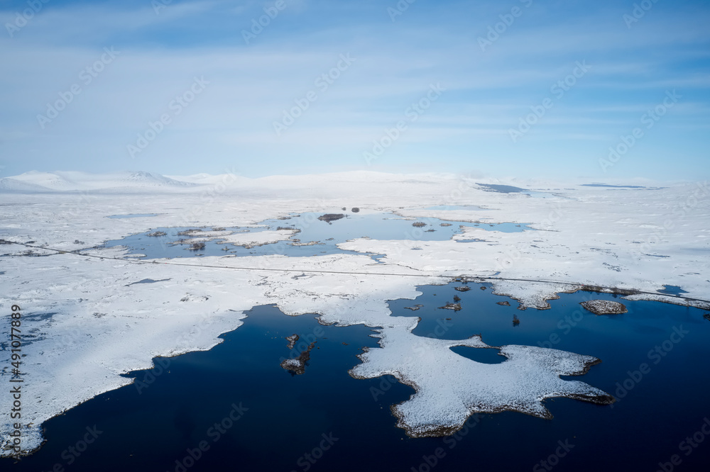 Rannoch Moor and Black Mount covered in snow during winter aerial view