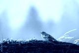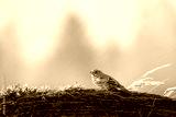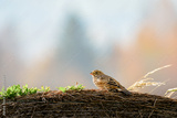 Corn bunting (Emberiza calandra) little bird sitting on the edge of a hay beam on a sunny day.