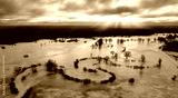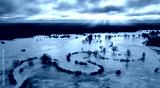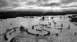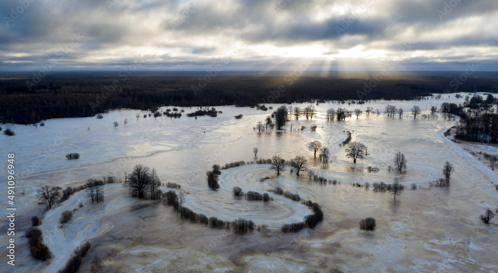 Aerial view to the sunrise colored floodplain with the frozen floodwater and river bends covered with old ice in Soomaa NP, Estonia
