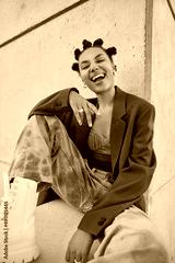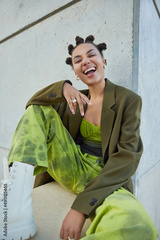 Happy brunette pretty teenage girl has upbeat mood laughs and sits against grey concrete wall dressed in green fashionable clothes expresses positive emotions. People free time and style concept