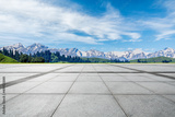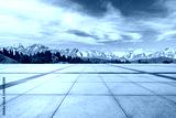 Empty square floor and snow mountain under blue sky. Road and mountain background.