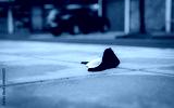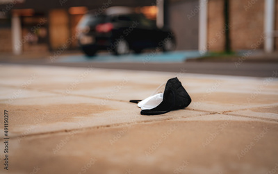 Used medical face mask discard on floor on blur car at parking lot and building in city. Medical waste. Dirty city. Medical face mask waste garbage on floor. Lack of social responsibility. Bad habit.