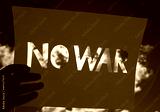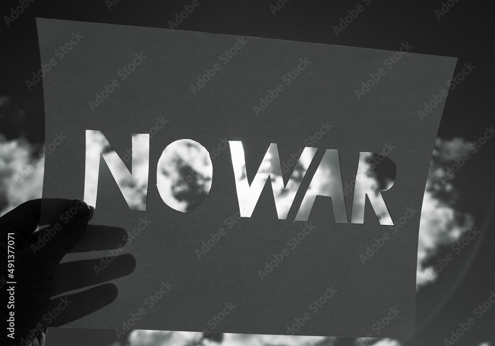 Hand holding up no war sign in protest against war in Ukraine