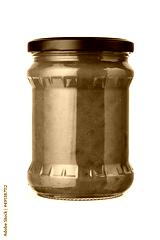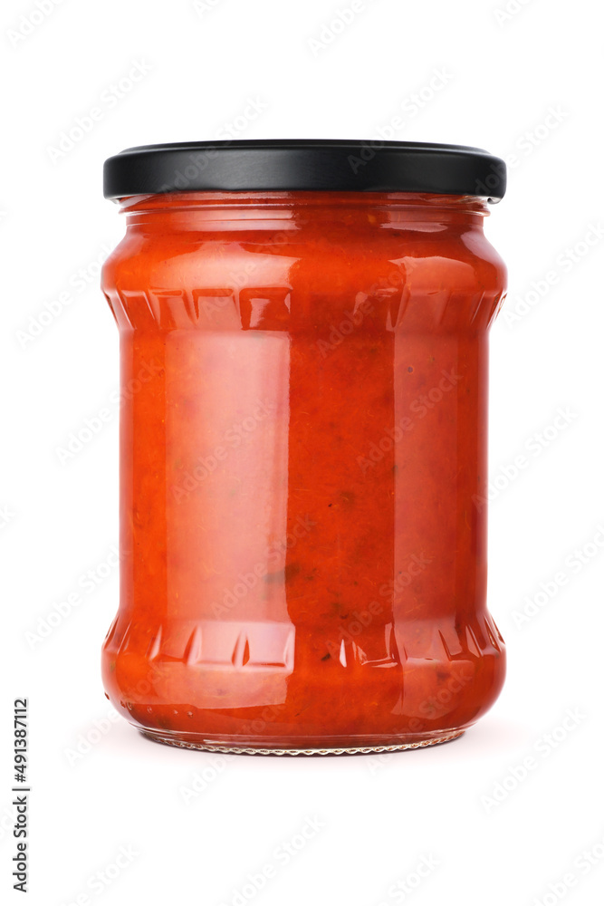 Adjika sauce in the glass jar isolated on white.