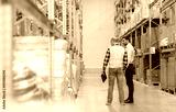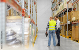 wholesale, logistic business and people concept - manual worker and businessman talking at warehouse