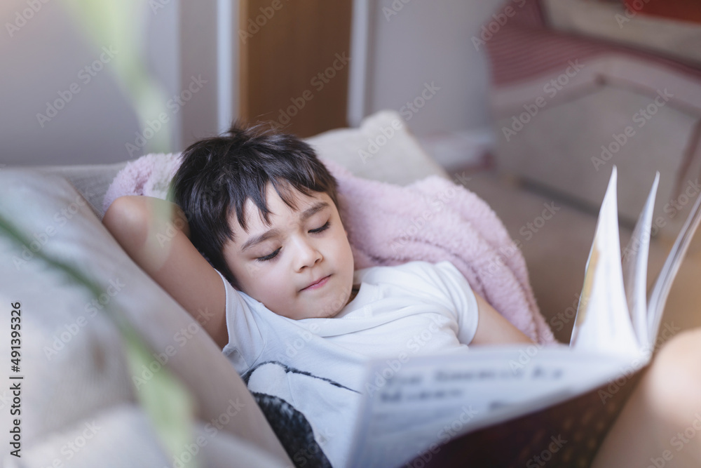 Happy School kid lying on sofa reading a book with morning light shining from window. Child boy reading story relaxing at home on weekend, Positive children concept