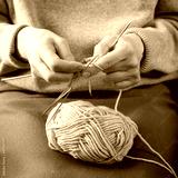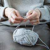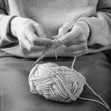 Hands of unrecognizable woman handmade knitting with spokes using wool yarn. Concept of hobby, leisure activity