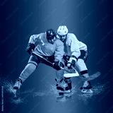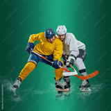 Professional ice hockey player hitting puck for winning goal in action on gradient multicolored neon background. Concept of sport competition.