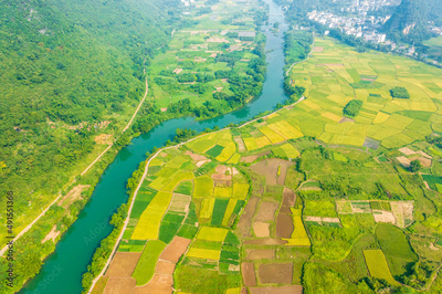 Aerial view of green rice field and river nature scenery in countryside. high angle view.