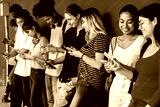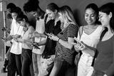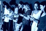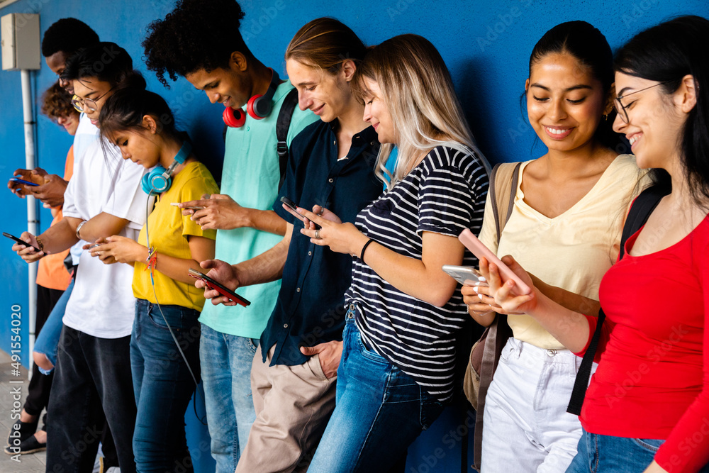Happy and smiling group of multiracial high school students using cellphone standing against blue wall. Social media.
