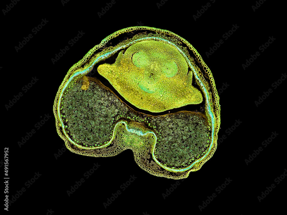 cross section cut slice of plant stem under the microscope – microscopic view of plant cells for botanic education – high quality