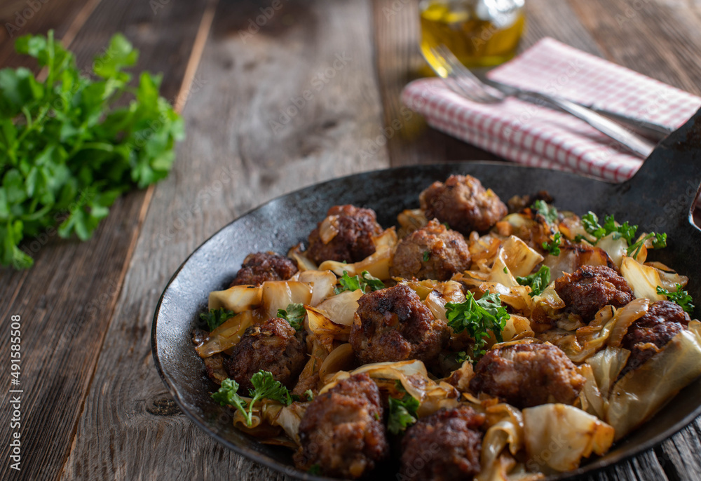 Fried meatballs with cabbage in a rustic pan on wooden table background