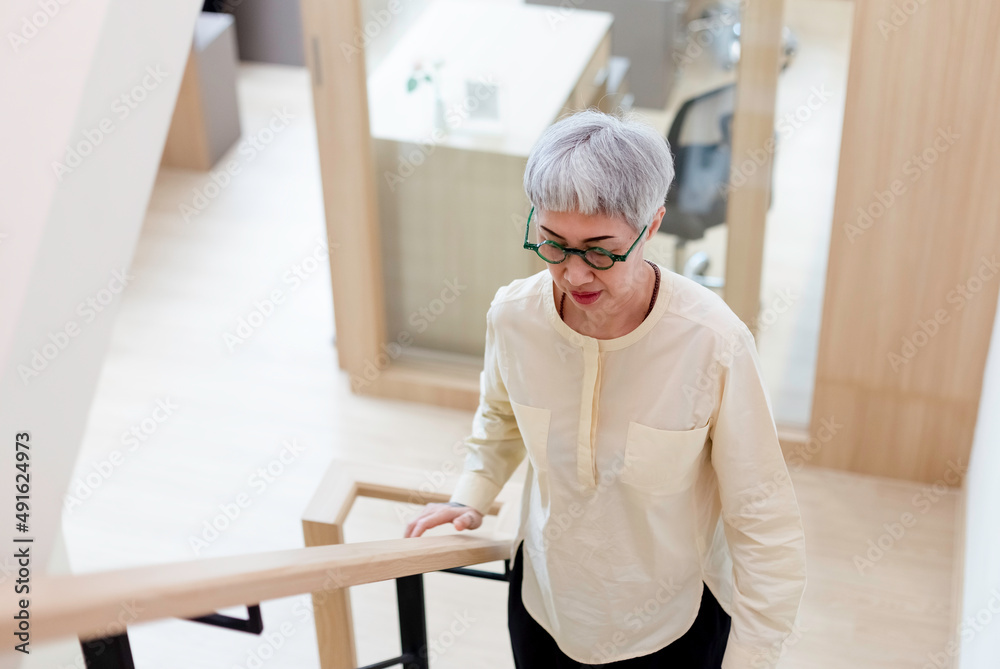 asian elderly woman walking up stairs in house. old woman went up stairs. เrandma home alone.