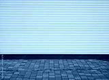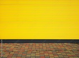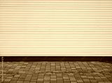 Yellow striped aluminium cladding wall and a tiled pavement with different colors. Background and texture, copy space